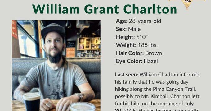 Heartbreaking news from Tucson this week 28-year-old William Grant Charlton was found dead in the Pima Canyon area after going missing during a solo hike. He set out on July 30 and wasn’t reported overdue until the next day. His car was found at the trailhead, but dangerous weather conditions delayed the search. Crews finally located him off-trail on August