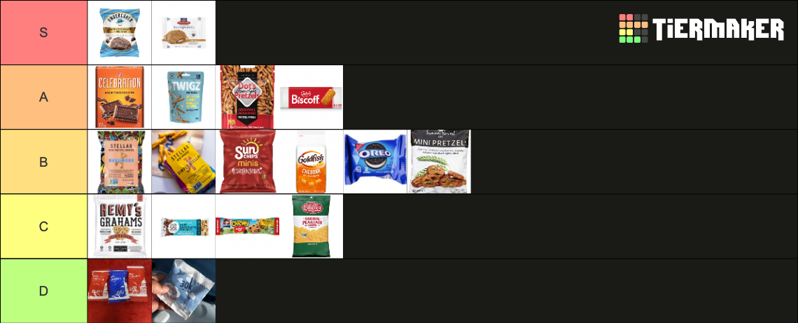 A-tier includes Dot’s Pretzels, Twix, and the...