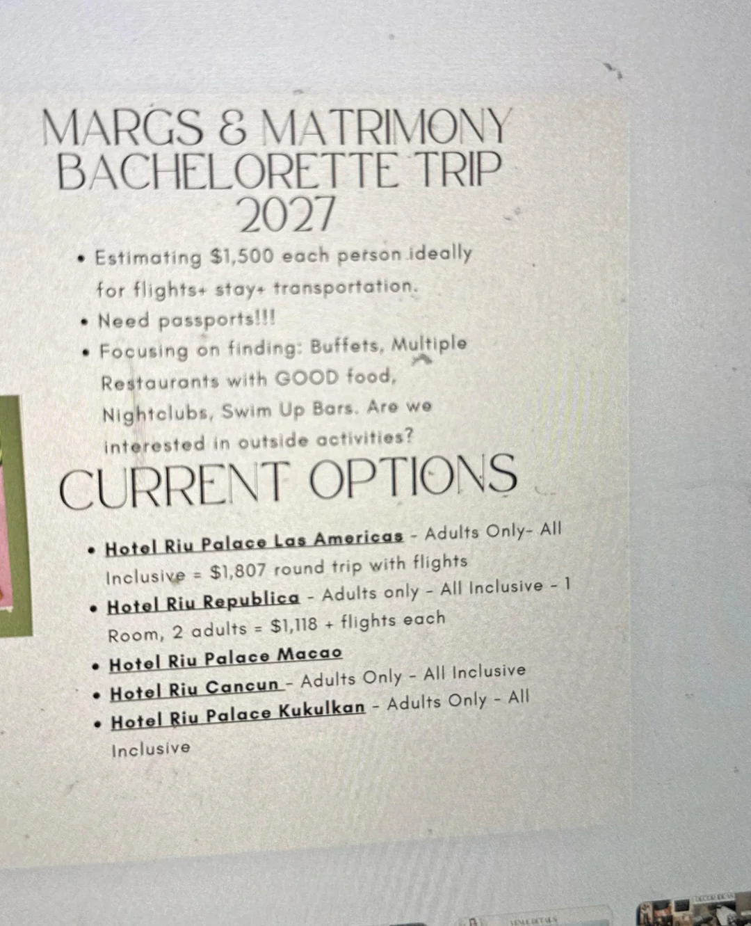 Planning a bachelorette trip for Sept 2027 and want to go all inclusive outside the US. Budget is around $1,500 per person including flights (I know flights aren’t out yet, just estimating). Top priorities are good food, multiple restaurants, a nightclub, and at least one swim...