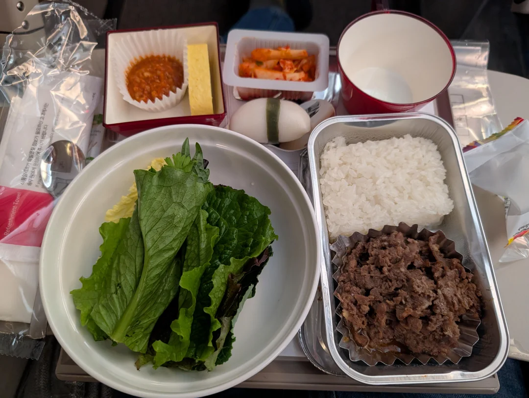 This is insane for economy class. Bulgolgi, hot rice, ssamjang, actual greens to wrap it, plus kimchi, soup, egg roll and dessert. On ICN to SYD, in the back of the plane. Not business, not premium. Regular economy. Stuff like this is why people still talk about Asiana with so...